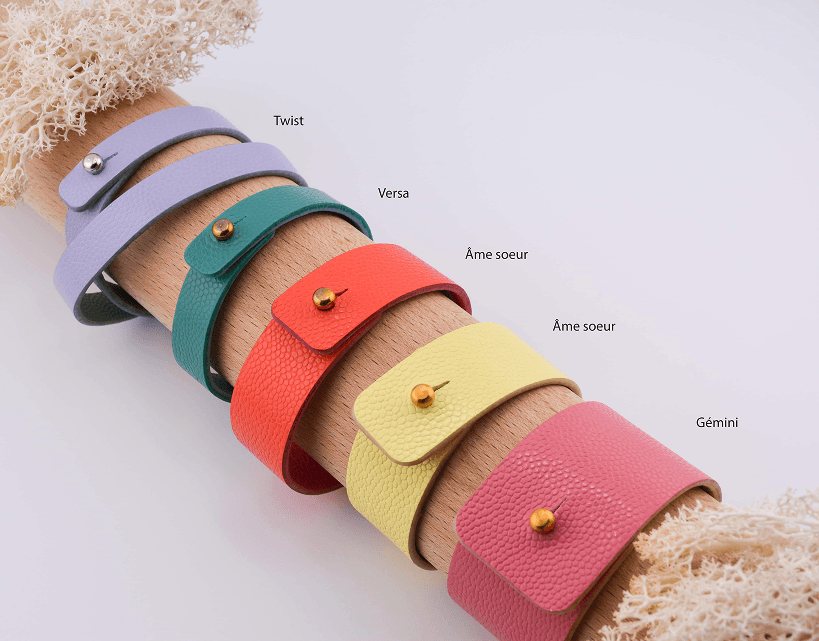 Design : Simple tour réversible , épuré et fémininMatière : Cuir de veau grainé « caviar », soigneusement sélectionné pour sa texture raffinée, à la fois douce et texturée, issu de stocks dormants de grandes maisonsCouleur : Duo harmonieux, teintes variées disponibles.Finition : Tranches délicatement polies et travaillées à la mainFabrication : Artisanale en petites séries, réalisée avec soin dans mon atelier près de Rennes en Bretagne (France)Fermeture : Bouton de col dévissable en finition laiton doré, laiton vieilli ou nickel. Réversible en un geste : dévissez, retournez, revissez pour porter le bracelet côté versoTaille : Longueur totale : 19,5-20 cm (Longueur utile pour le poignet : 17 cm) – Largeur 1 cmSi les tailles proposées ne correspondent pas, contactez-nous par email pour une création sur mesure